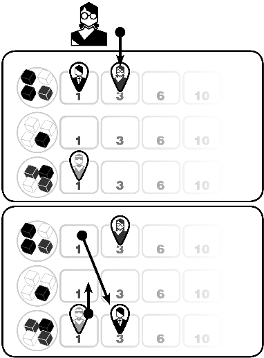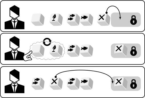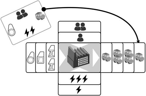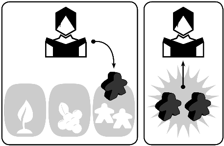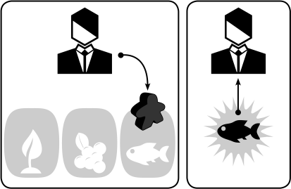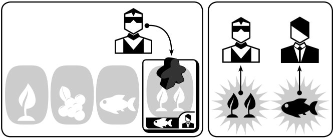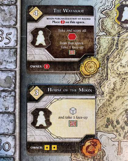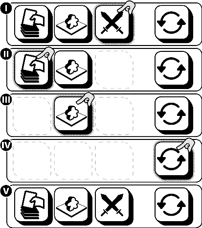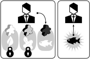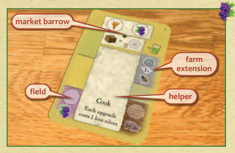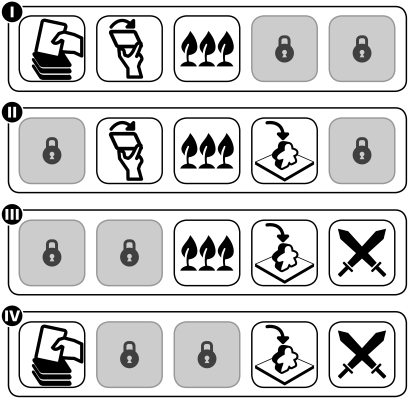 In this mechanism, the cards are typically broken up into clearly defined areas, each of which presents the player with a different option. Note: We use “cards” throughout this entry, as that is the most common implementation. Tiles may also be used, although this mechanism can also be used on tiles or other components. However, it does require a certain amount of real estate to make the choices clear, so cards tend to be the component of choice. This mechanism presents the players with two or more choices, and they can select only one to perform. For example, in La Granja, each card has four different abilities that can be used, each of which is arranged on the edge of a card. The clever player mat allows for cards to be tucked under any of its four edges, so only the operative section of the card is showing. Once