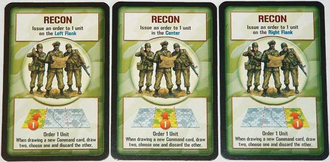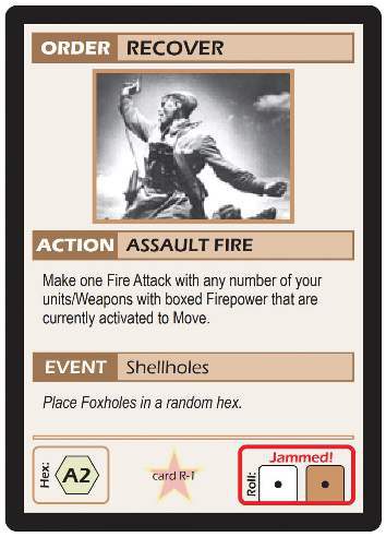 An alternative approach to Multi-Use cards is to allow the cards themselves to be used as physical objects, typically as a discard. For example, in Race for the Galaxy, cards must be discarded to pay to play other cards. In The Ares Project, cards can be played either face up, typically creating a structure that can create units, or face down on those structures where they represent the resources required for the units to be built. The Multi-Use cards in Combat Commander have six functions in the game; however, only two are options for the players. At the top of the card is an Order that players can issue on their turn. Next, there is an Action, which can be used either on their own or on their opponent’s turn. Below the Action is an Event. Randomly, the players may be required to flip the top card of their deck and perform the Event. Finally, at the bottom left is a Random Hex, which can be used for some events and other game functions, and at the bottom right a series of die rolls, which are used to resolve actions. Additionally, the die rolls may be in a special “trigger” box which can generate events, sniper attacks, or jam guns (Illustration 13.1b). Illustration 13.1b The cards in Combat Commander serve many purposes. Players use Orders and Actions to command their units. The other features are various types of randomizers.