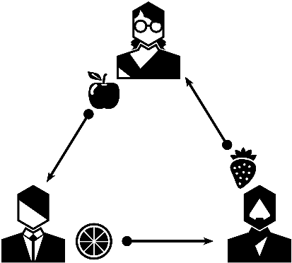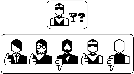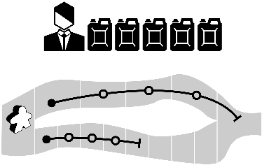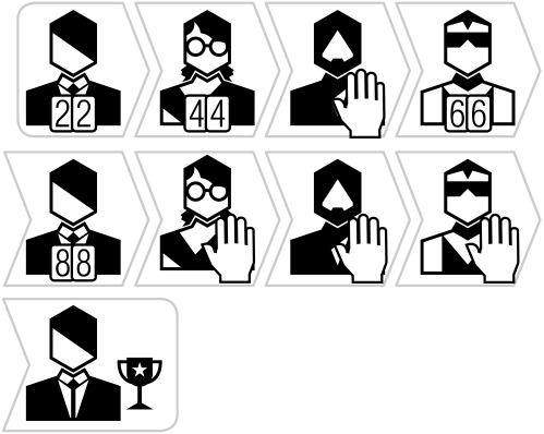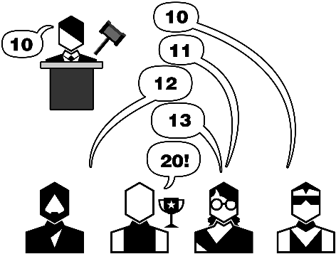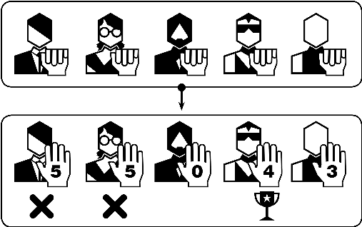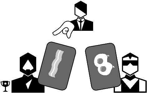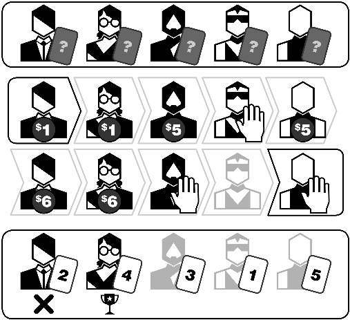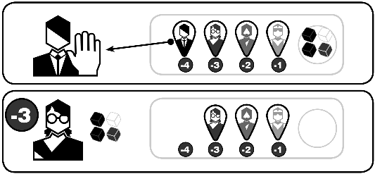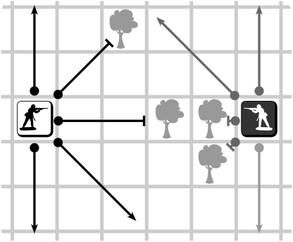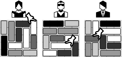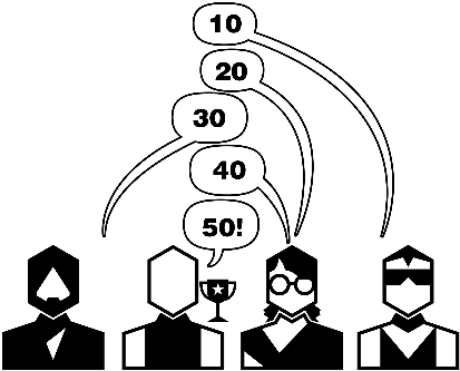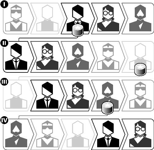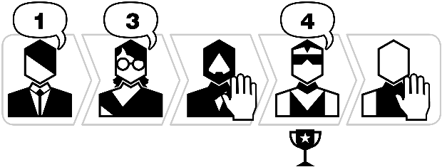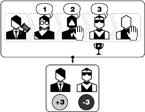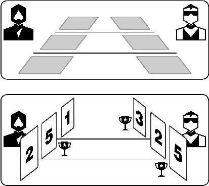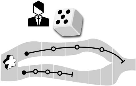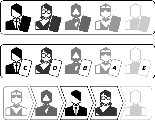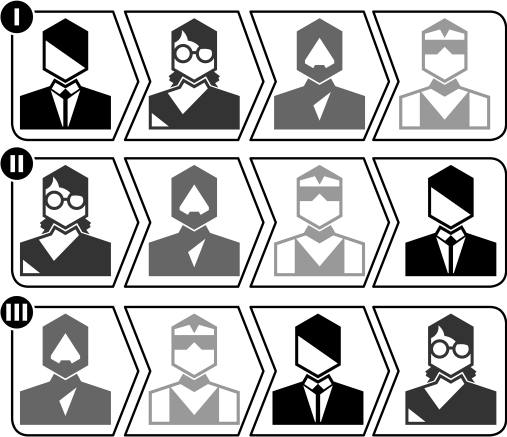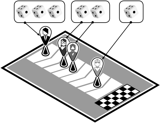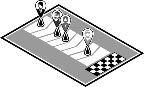 This is the most familiar game structure, the one we encounter as children in games like Candyland and Snakes & Ladders. Competitive games still make up the large majority of the market for tabletop games. Tey typically offer a symmetry of expectations: putting aside the impacts of unusual luck and skill, each player begins the game with a roughly equivalent chance of victory. When this promise is broken, the game is considered imbalanced and may even be tagged with the label “broken.” As we’ll discuss later (see “Variable Player Powers” in this chapter and “Variable Setup” in Chapter 6), players may have perfectly symmetric factions and starting conditions or highly asymmetric ones. But, in both cases, it’s important that the game offers roughly even chances of victory to each player (Illustration 1.1). In many games, there is an asymmetry that in-game balancing alone can’t solve, like the first-mover advantage in chess or the service advantage in tennis. Competitive games often balance these advantages through meta-structures, like tournaments, that offer each player an equal number of chances to play from the advantaged position. In multiplayer games, this may be less practical. Instead, players may be offered other opportunities to balance any perceived or actual inequities, like the bidding in Bridge, betting in Poker, or the early alliances in Diplomacy.