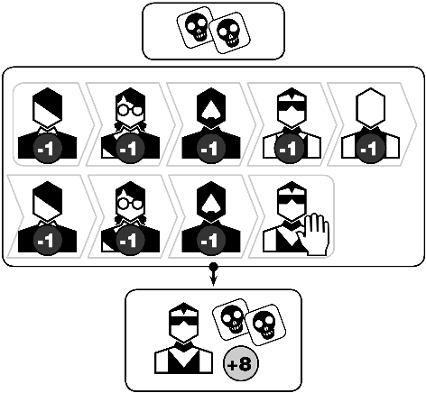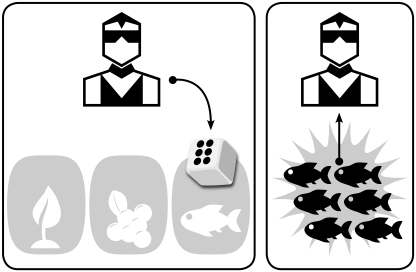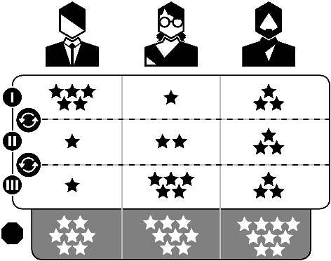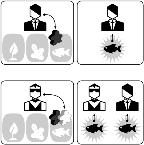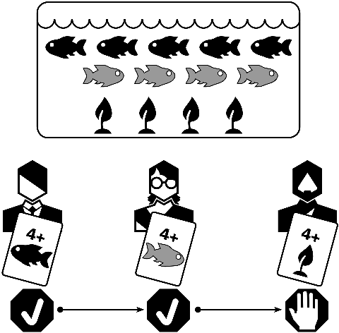 a semi-cooperative structure can create memorable moments of last-second betrayal and competitive jockeying for position. Semi-cooperative games are fascinating as a design study because of how players engage with them. Many groups will play semi-cooperatives as co-ops, ignoring the individual win conditions or treating them as a means for recognizing a great performance by some players, rather than as a win condition to be claimed. Others will embrace the notion of an individual win and engage in brinksmanship in almost total violation of the cooperative element of the game. Despite the broad range of possible play styles, each group typically has a very narrow idea of the “right way” to play the game. In other words, it’s unlikely that the same group would play Arkham Horror as a total co-op one night and then as a semi-co-op another night. Actually, you might be hard-pressed to find anyone who plays Arkham Horror with any care for the individual win condition. The game holds little attraction for players looking for that experience. Crafting a semi-co-op that is satisfying to play and that manages to incentivize both the individual and cooperative aspects of the game is like trying to land a jet plane in a phone booth. Another route a designer can consider is introducing cooperative elements into a competitive game without creating a cooperative loss condition. Games like Kingsburg and Survive: Escape from Atlantis achieve this in different ways. In Kingsburg, all players must face a common foe at the end of each year. In Survive, players can share common resources like lifeboats to escape the ocean’s dangers. These cooperative opportunities can enrich the game and create internal drama without confusing players as to their incentives or causing distress over what type of game players they thought they sat down to. Note that this structure is not applicable to games where players sometimes cooperate and sometimes compete but where one player ultimately wins. The “everyone loses” condition is a necessary component of semi-cooperative games under our definition. Games that feature both cooperation and competition but only a single winner are not structurally distinct from competitive games (STR-01), though they often have explicit Negotiation mechanisms (ECO-18).
