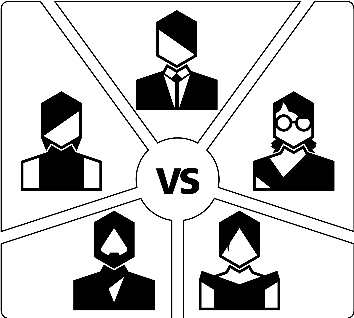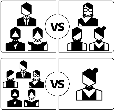 In team-based games, teams of players compete with one another to obtain victory. There are a variety of possible team structures, including symmetrical teams like 2v2 and 3v3, multiple sides like 2v2v2, and even One vs. All.