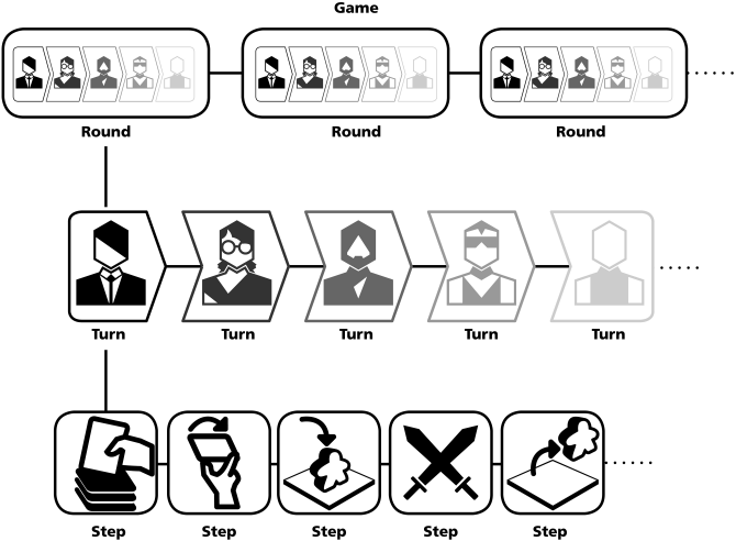 Turn Order and Structure ў ў One of the elements that separates “games” from “play” is the introduction of structure. This takes many forms, including restrictions on how players perform activities and when they may perform them. Out of this arises the concept of a turn—an order or structure within which players take their actions. The concept of taking turns is one of the first game-based concepts taught to young children. Many simple games, like Candyland, exist to teach how to wait your turn, among other early building blocks of playing games. The turn structure of a game can set the tone for the entire experience, whether it is playful, strategic, or intense. Selecting the appropriate turn structure for the game is an important part of the design process. This section includes a wide variety of these structures, including some that, while appearing unstructured, like Real-Time Games, actually contain their own internal structure, logic, and design challenges. DOI: 10.1201/9781003179184-2